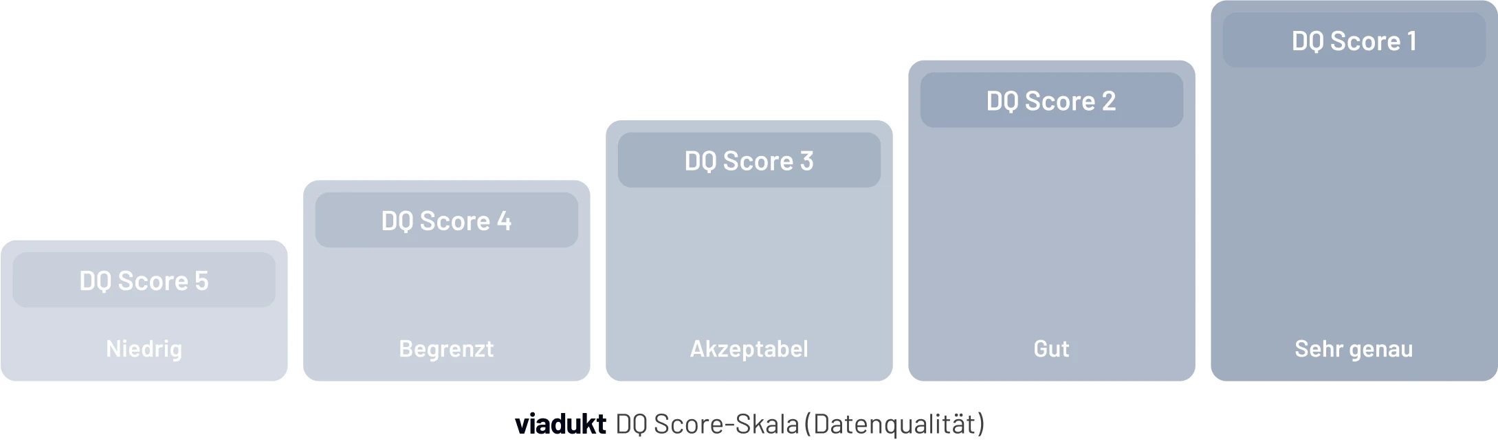 Der viadukt Datahub folgt der PCAF-Systematik zur Bewertung von Emissions- und ESG-Daten. Die Datenqualität wird auf einer Skala von 5 (niedrig) bis 1 (hoch) eingestuft – abhängig von Herkunft, Genauigkeit und Nachvollziehbarkeit der Daten.