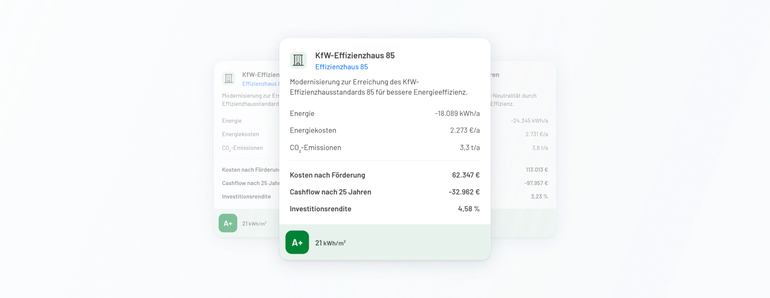 Für jedes Gebäude wird geprüft, welche Effizienzhaus Standards grundsätzlich erreichbar sind. Auf dieser Basis erstellt Viadukt automatisch umsetzbare cashflow optimierte Modernisierungsszenarien.