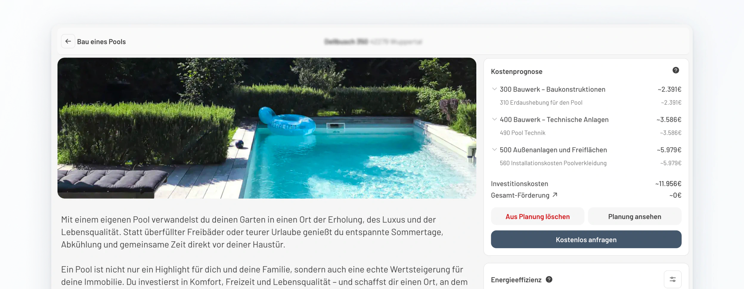 Durch die erweiterten Maßnahmen lassen sich nun energetische, technische und komfortbezogene Investitionen in einer gemeinsamen Planung abbilden. Das schafft Transparenz über Gesamtkosten, Förderfähigkeit und Finanzierungsmöglichkeiten.