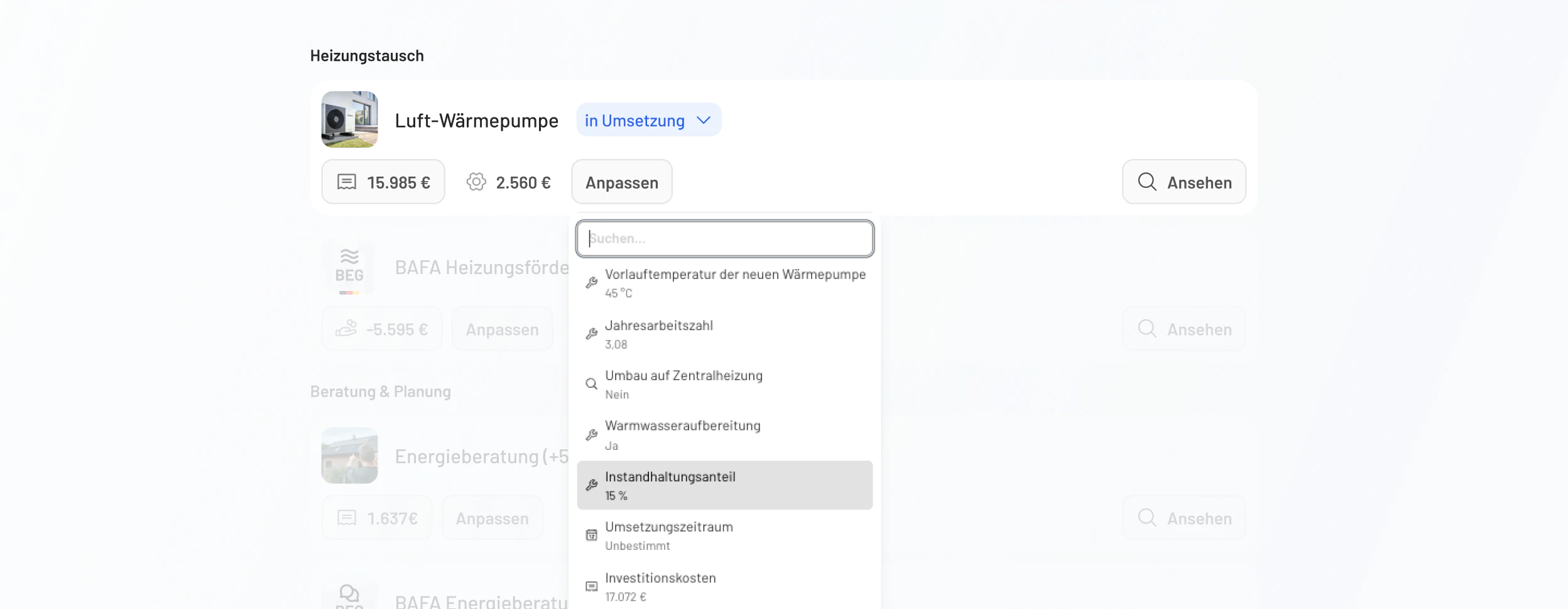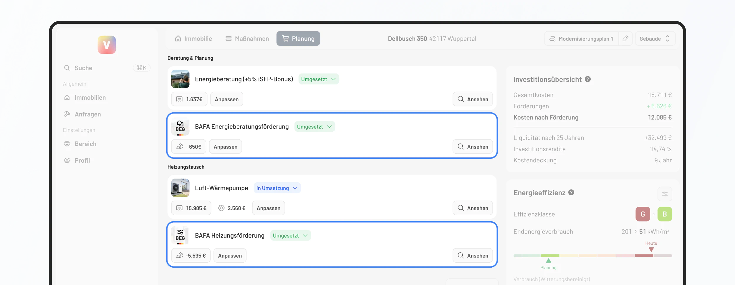 Förderungen werden ab sofort als eigenständige Maßnahmen modelliert. Dadurch können einzelne Förderprogramme sauber abgebildet, detaillierter konfiguriert und klar von baulichen Maßnahmen getrennt werden.